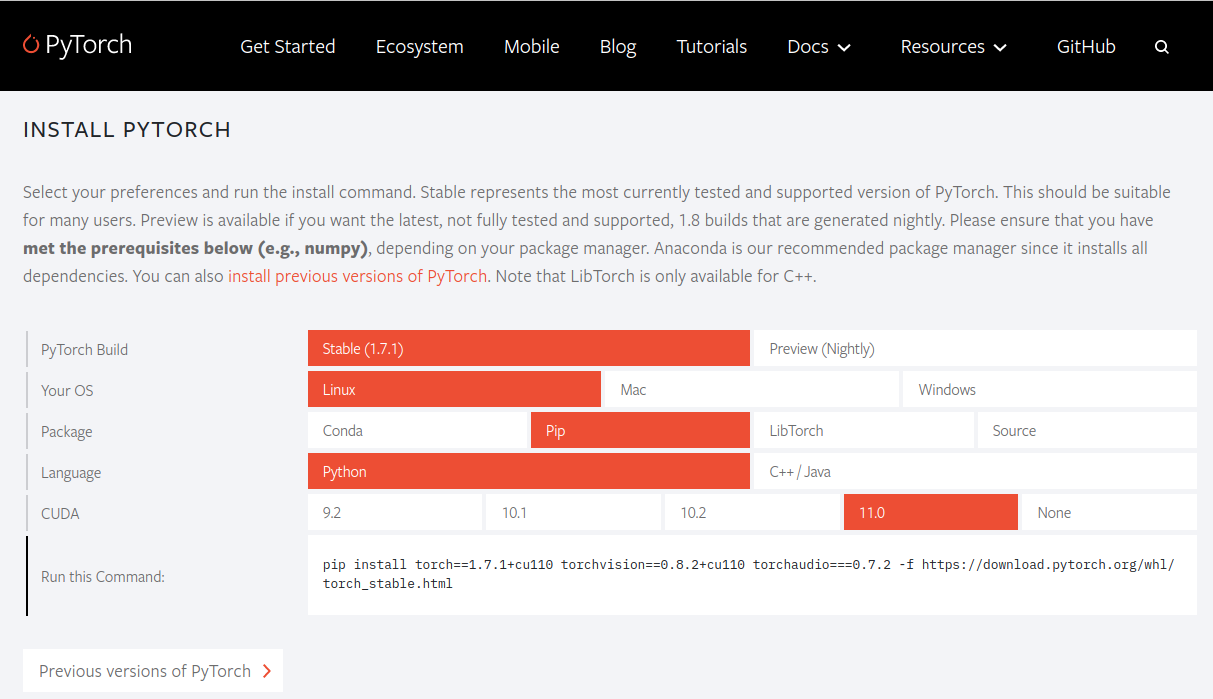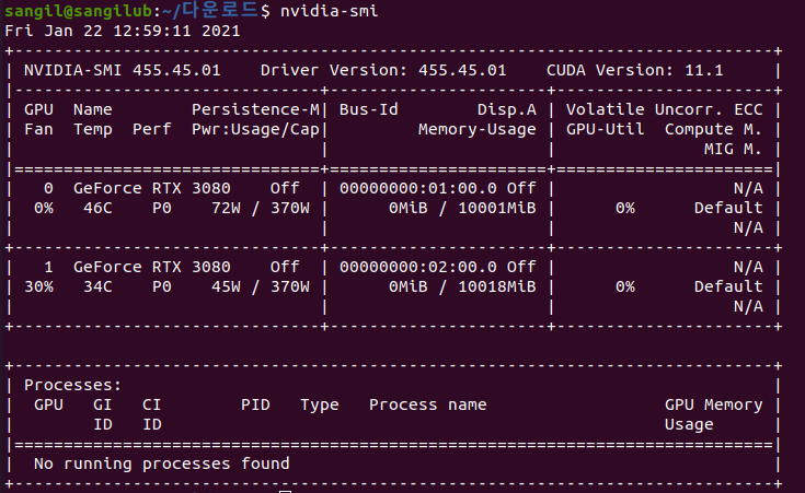 그게 껄끄럽다면 아래 개발자버전을 이용하여 설치하면 3080 과 잘 호환되는 것을 알 수 있다.