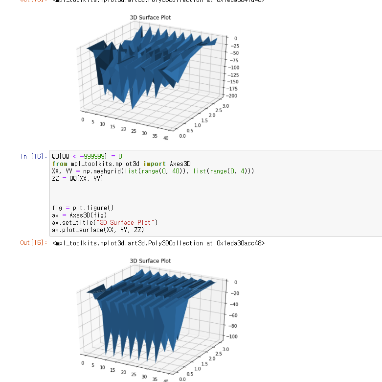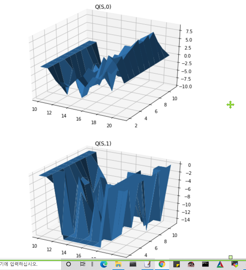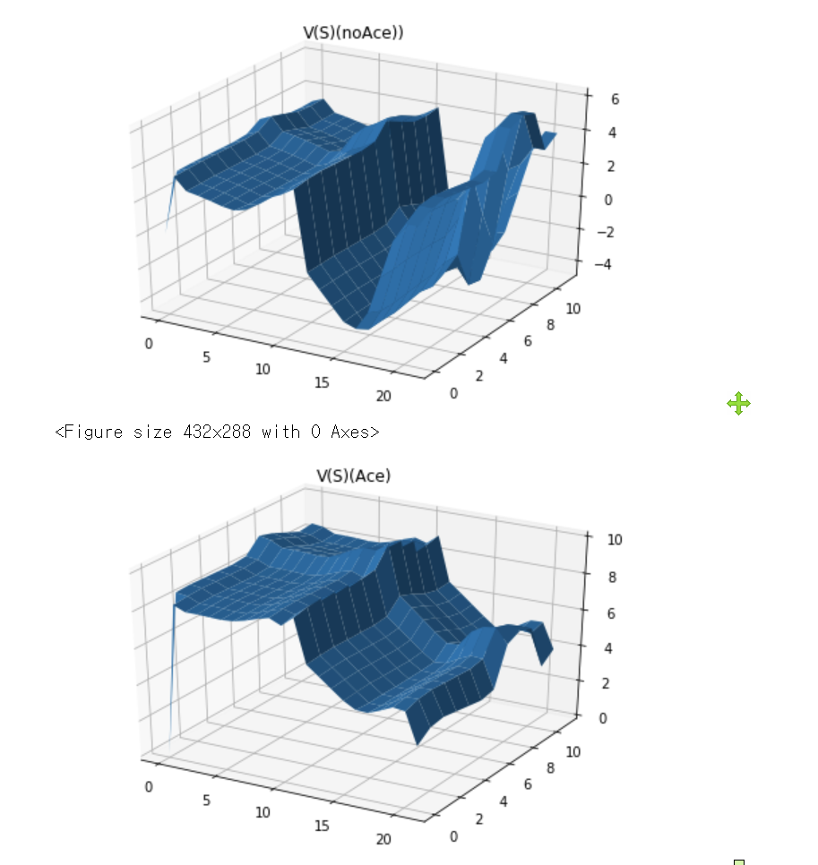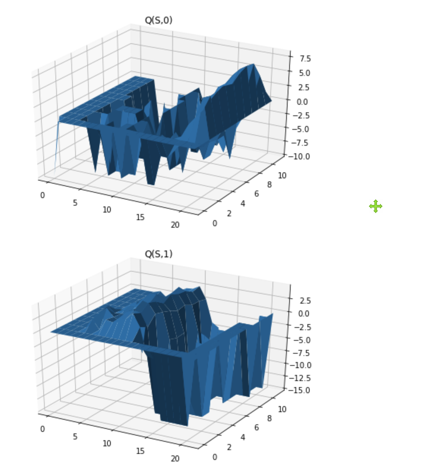 어찌됫건 ace 가있는경우 Q(S,1) 값이 ace 없는 경우 Q(S,1) 보다 대체적으로 높게나온것을 볼수 있다.