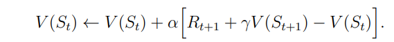 TD method 는 중간에 Value function 를 v(s) = v(s) + a( g(t) - v(st) ) 이렇게 업데이트하는데, 여기서 g(t) 는 우리가 구한 value_function 이 아니라 t 시간이후의 이득(?) 이고 이 값을 (Rt+1 + rV(st+1) ) 값으로 대체 하여