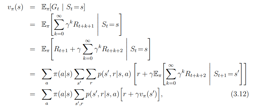 7. 6 에서 정의한 내용들은 Bellman Equation(3.12), 아래와 같이 가치 함수(s) = 시그마(가치함수(s')* 상태전이확률) 을 만족해야한다. 이때 이후 가치함수를 이용함으로써 현재 가치를 알아내기 때문에 Bootstrap 기법이라고 하기도한다.